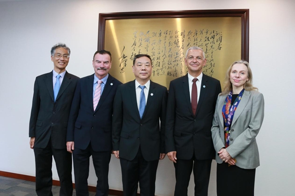 (左起中注协副秘书长唐建华、IFAC执行总裁李·怀特、中注协秘书长江湧、IFAC主席让·布科特、IFAC副主席塔伦·罗顿)